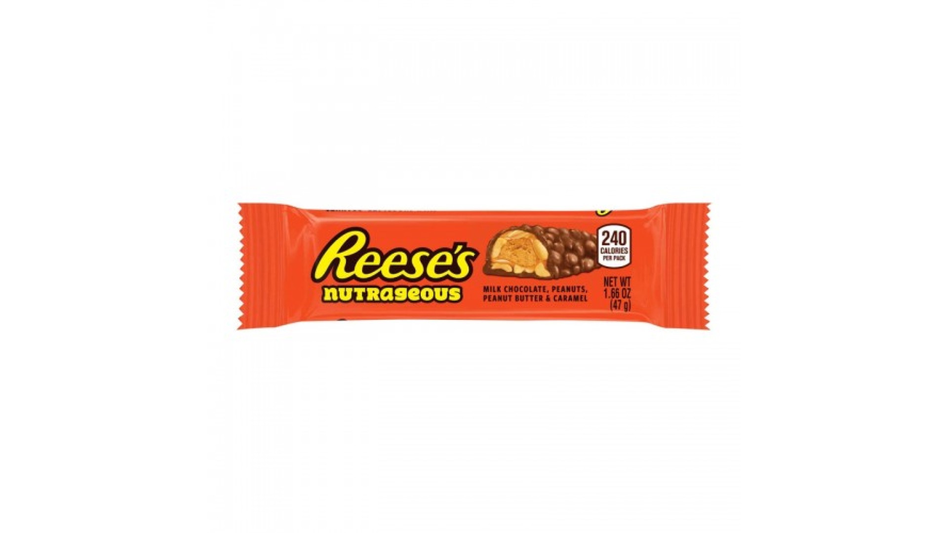 Reeses Nut Bar chocolate bar: chocolate, crunchy peanuts, Reeses peanut butter and caramel.